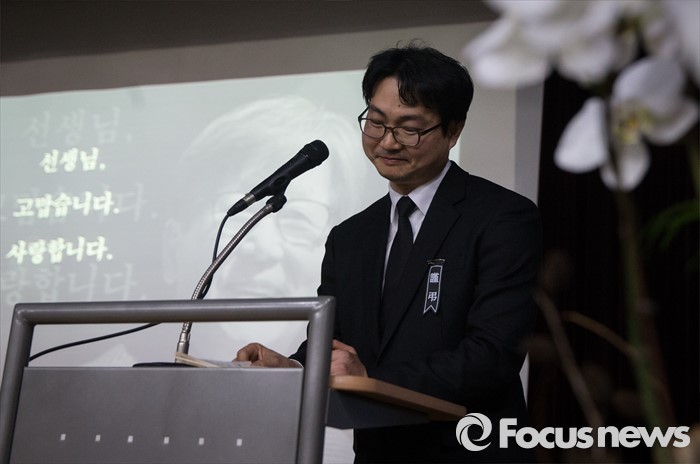 (서울=포커스뉴스) 17일 밤 서울 구로구 성공회대학교에서 열린 '신영복 교수 추모의 밤' 행사에서 '더불어 숲' 관계자가 추모사를 하고 있다.