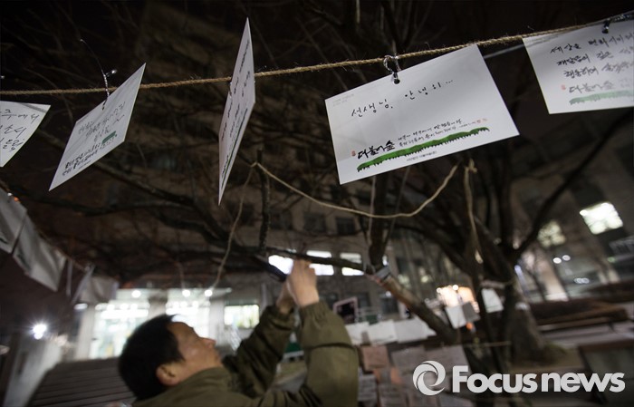 (서울=포커스뉴스) 17일 밤 서울 구로구 성공회대학교에서 어느 한 시민이 故 신영복 성공회대 석좌교수를 추모하기 위해 조문객들이 붙여 놓은 엽서들을 정리하고 있다.