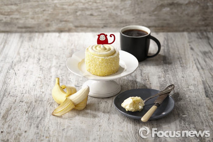 신제품 ‘2016 럭키 몽키 케이크’는 시트 사이에 생크림을 넣은 바나나맛 케이크로 이벤트 시즌 동안만 판매된다. 가격은 5600원.스타벅스가 마이 스타벅스 리워드 회원 200만명 돌파 기념으로 출시한 럭키 몽키 케이크. <사진제공=스타벅스커피 코리아>