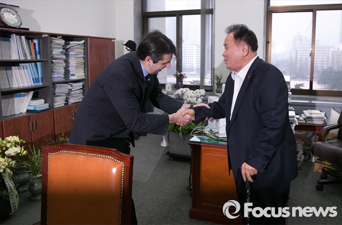 (서울=포커스뉴스) 이상민(오른쪽) 법제사법위원장이 18일 오전 서울 여의도 국회 위원장실에서 4개국 외교사절(미국, 영국, 호주, EU)을 대표해 방문한 마크 리퍼트 주한미국대사와 외국법자문사법 개정안과 관련 논의에 앞서 인사하고 있다.