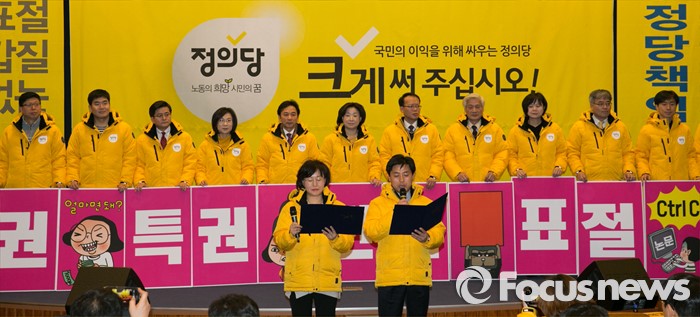 (서울=포커스뉴스) 18일 오전 서울 여의도 국회 헌정기념관에서 열린 정의당 2016 총선 수도권 후보 발대식에 참석한 심상정 상임대표 등 지도부와 후보들이 총선 승리를 다짐하는 퍼포먼스를 하고 있다.