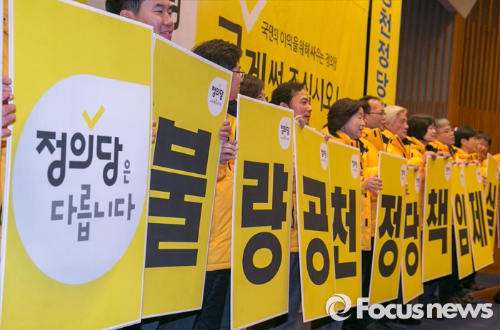 (서울=포커스뉴스) 18일 오전 서울 여의도 국회 헌정기념관에서 열린 정의당 2016 총선 수도권 후보 발대식에 참석한 심상정 상임대표 등 지도부와 후보들이 총선 승리를 다짐하는 퍼포먼스를 하고 있다.