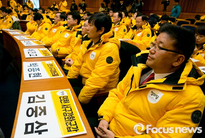 (서울=포커스뉴스) 18일 오전 서울 여의도 국회 헌정기념관에서 열린 정의당 2016 총선 수도권 후보 발대식에 참석한 후보들이 심상정 상임대표의 인사말을 듣고 있다.