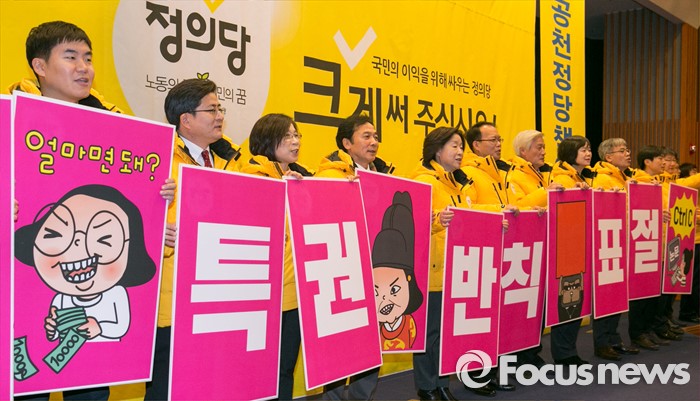 (서울=포커스뉴스) 18일 오전 서울 여의도 국회 헌정기념관에서 열린 정의당 2016 총선 수도권 후보 발대식에 참석한 심상정 상임대표 등 지도부와 후보들이 총선 승리를 다짐하는 퍼포먼스를 하고 있다.