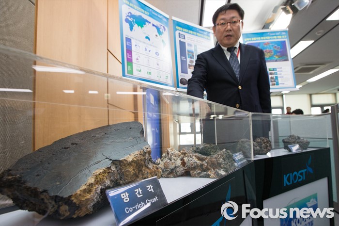 (세종=포커스뉴스) 지상범 한국해양과학기술원 해저환경·자원 연구본부장이 18일 오전 세종시 정부세종청사 해수부 기자실에서 브리핑을 열고 심해저에서 채집된 망간단괴를 파이프를 이용해 수면 위 채광선으로 이송하기 위한 시스템(양광시스템)을 개발, 해상 실증시험에 대한 설명을 하고 있다.