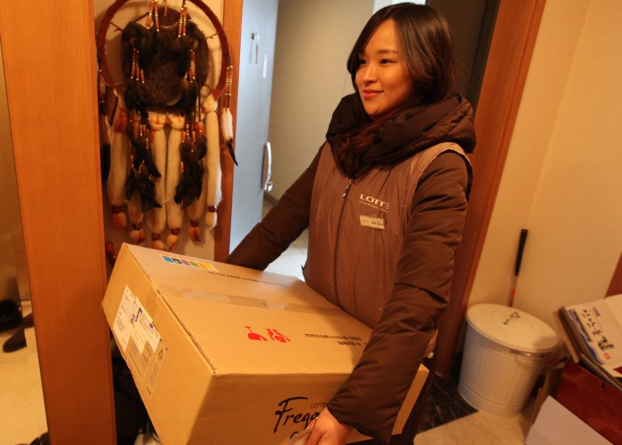 한편 롯데백화점은 설 배송 서비스를 담당 할 아르바이트 인력을 모집한다. 18일부터 점포별로 단계적으로 채용하며, 채용 규모는 5000명으로 지난해 설과 비슷하다.롯데백화점 배송 담당 직원이 설 선물세트를 소비자에게 전달하고 있다.<사진제공=롯데백화점>