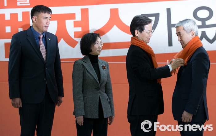 (서울=포커스뉴스) 천정배 국민회의 창당준비위원장이 18일 오후 서울 여의도 당사에서 열린 인재입당식에 참석해 입당인사들에게 당 상징 목도리를 매주고 있다. 왼쪽부터 김영수 전 해군소령, 천 위원장, 장정숙 전 서울시의원, 채수창 전 화순경찰서장.