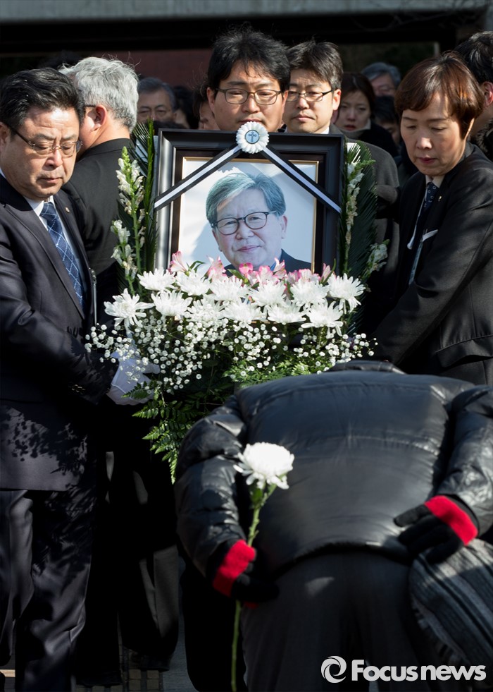 (서울=포커스뉴스) 18일 오후 서울 구로구 성공회대학교 대학성당에서 故 신영복 석좌교수 영결식이 끝나고 고인의 영정과 유해를 운구하는 중 한 시민이 인사를 하고 있다.