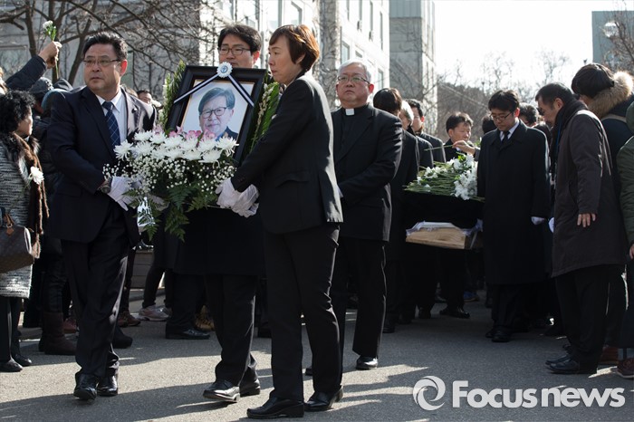 (서울=포커스뉴스) 18일 오후 서울 구로구 성공회대학교 대학성당에서 故 신영복 석좌교수 영결식이 끝나고 고인의 영정과 유해가 운구되고 있다.