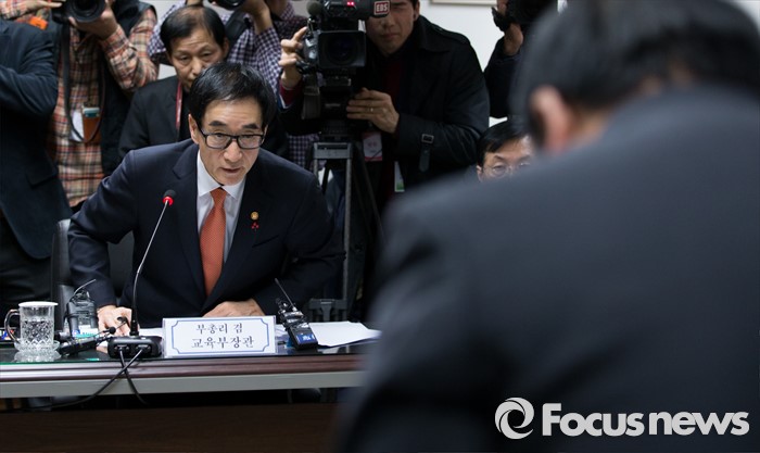 (서울=포커스뉴스) 18일 오후 서울 종로구 정부서울청사에서 이준식(왼쪽) 부총리 겸 교육부 장관이 전국 시도교육감협의회 회장단 간담회에 참석해 장휘국 광주시교육감의 모두발언을 경청하고 서로 인사를 하고 있다.