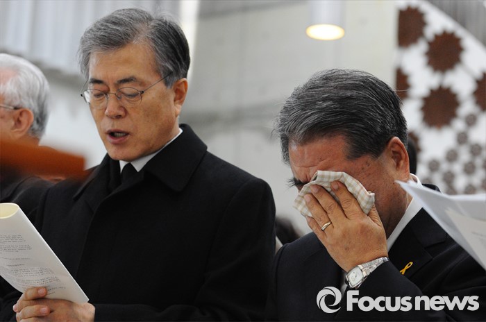 (서울=포커스뉴스) 18일 오후 서울 구로구 성공회대학교 대학성당에서 열린 故 신영복 석좌교수 영결식에서 문재인(왼쪽) 더불어민두장 대표와 이재정 경기도교육감이 참석하고 있다. <사진제공=성공회대>