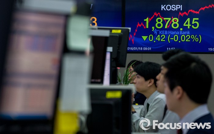 (서울=포커스뉴스) 코스피 지수가 중국 경제에 대한 불안감과 국제유가 하락 등의 여파로 전 거래일 대비 0.42포인트(0.02%) 하락한 1878.45로 마감한 18일 오후 서울 중구 KEB하나은행 딜링룸에서 딜러들이 업무를 보고 있다. 이날 원달러 환율은 전 거래일보다 1.5원 하락한 1,210.9원, 원위안 환율은 전거래일보다 0.63원 오른 183.93원에 장을 마쳤다.