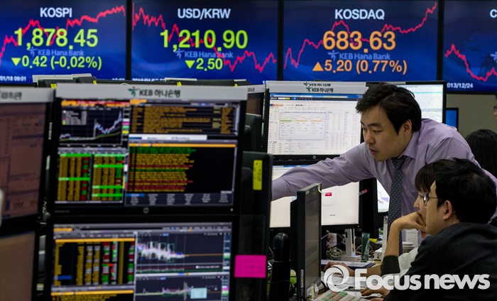(서울=포커스뉴스) 코스피 지수가 중국 경제에 대한 불안감과 국제유가 하락 등의 여파로 전 거래일 대비 0.42포인트(0.02%) 하락한 1878.45로 마감한 18일 오후 서울 중구 KEB하나은행 딜링룸에서 딜러들이 업무를 보고 있다. 이날 원달러 환율은 전 거래일보다 1.5원 하락한 1,210.9원, 원위안 환율은 전거래일보다 0.63원 오른 183.93원에 장을 마쳤다.