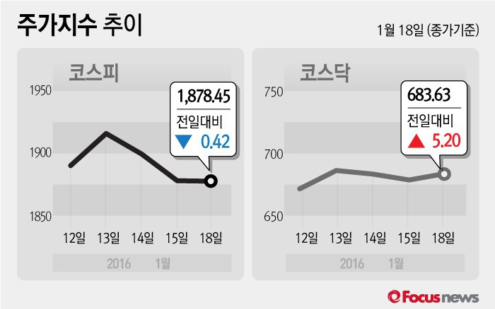 18일 코스피지수는 전거래일 대비 0.02%(0.42포인트) 내린 1878.45에 장을 마쳤다. 코스닥지수는 전거래일 보다 0.77%(5.20포인트) 오른 683.63에 마감했다.