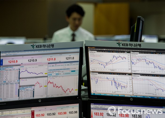 (서울=포커스뉴스) 코스피 지수가 중국 경제에 대한 불안감과 국제유가 하락 등의 여파로 전 거래일 대비 0.42포인트(0.02%) 하락한 1878.45로 마감한 18일 오후 서울 중구 KEB하나은행 딜링룸에서 딜러들이 업무를 보고 있다. 이날 원달러 환율은 전 거래일보다 1.5원 하락한 1,210.9원, 원위안 환율은 전거래일보다 0.63원 오른 183.93원에 장을 마쳤다.