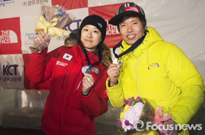 한편 노스페이스는 국내 아웃도어 업계 최초로 '2018 평창동계올림픽'의 스포츠의류 부문 공식후원사로 채택됐다.2016 아이스클라이밍 월드컵 메달을 들어보이는 박희용(오른쪽)·신운선 선수 <사진제공=노스페이스> 2016.1.18 김현이 인턴기자