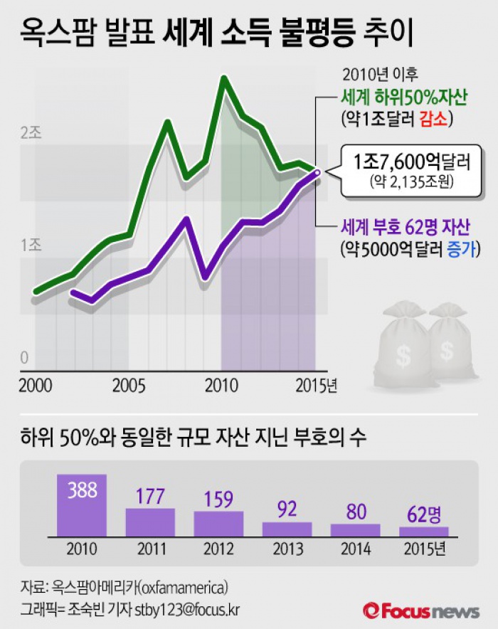 (서울=포커스뉴스) 국제 구호단체 옥스팜은 이번에 발표한 '1%를 위한 경제' 보고서를 통해 전 세계에서 가장 부유한 62명이 세계 인구 절반이 가진 부를 모두 합친 것만큼의 자산을 보유하고 있다고 밝혔다.