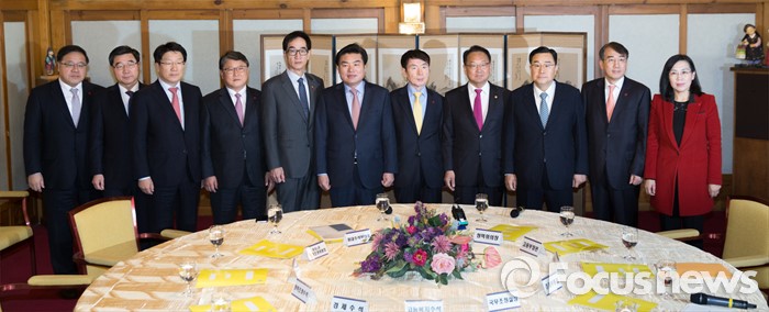 (서울=포커스뉴스) 19일 오전 서울 종로구 삼청동 국무총리공관에서 열린당·정·청 정책조정협의회에서 왼쪽부터 안종범 청와대 경제수석, 이기권 고용노동부 장관, 권성동 새누리당 전략기획본부장, 조원진 새누리당 원내수석부대표, 이준식 사회부총리 겸 교육부 장관, 원유철 새누리당 원내대표, 현정택 청와대 정책조정수석, 유일호 경제부총리 겸 기획재정부 장관, 김정훈 새누리당 정책위의장, 이석준 국무조정실장, 김현숙 청와대 고용복지수석이 기념촬영을 하고 있다.