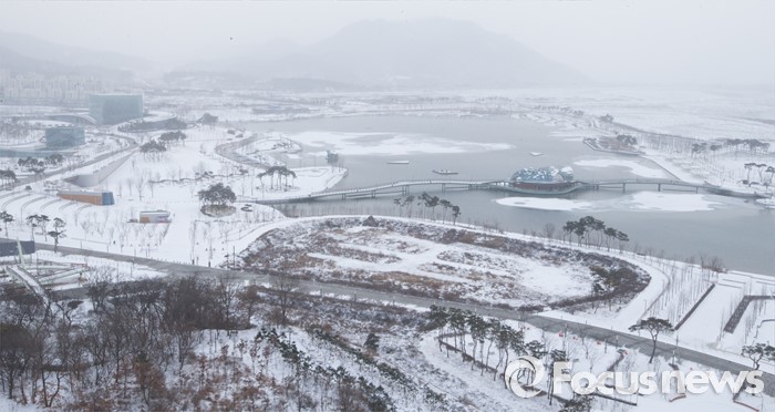 (세종=포커스뉴스) 지난 18일 밤에 내린 눈으로 19일 오전 세종시 호수공원 주변이 하얀 설경을 보이고 있다.