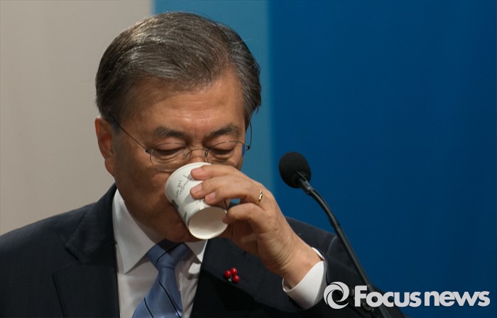 (서울=포커스뉴스) 문재인 더불어민주당 대표가 19일 오전 서울 여의도 국회 의원회관 대회의실에서 신년 기자회견에 앞서 리허설 중 물을 마시고 있다.