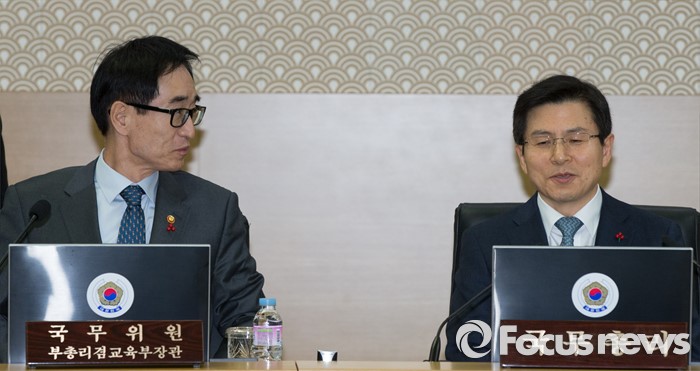 (세종=포커스뉴스) 황교안 국무총리가 19일 오전 세종시 정부세종청사 국무회의장에서 열린 청와대-세종청사 영상 국무회의에 참석해 이준식 사회부총리 겸 교육부장관과 대화하고 있다.