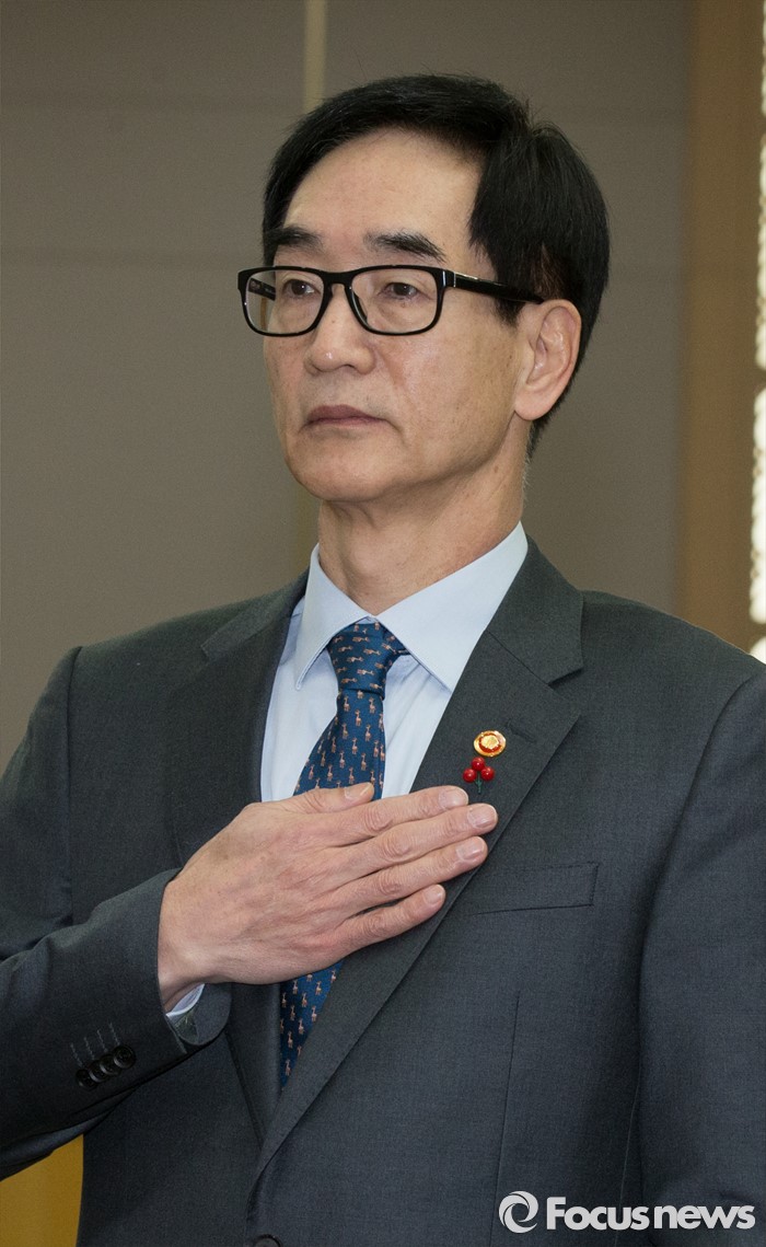 (세종=포커스뉴스) 이준식 사회부총리 겸 교육부장관이 19일 오전 세종시 정부세종청사 국무회의장에서 열린 청와대-세종청사 영상 국무회의에 참석해 국기에 대한 경례를 하고 있다.
