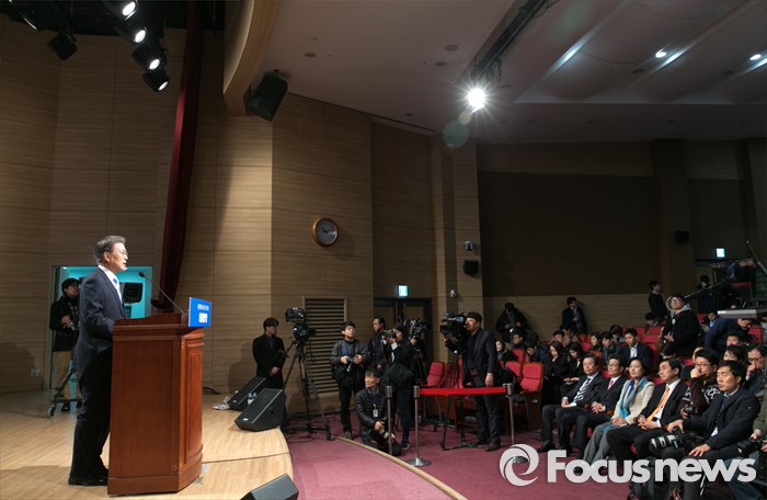 (서울=포커스뉴스) 문재인 더불어민주당 대표가 19일 오전 서울 여의도 국회 의원회관 대회의실에서 신년 기자회견을 하고 있다.