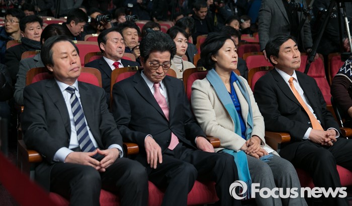(서울=포커스뉴스) 이종걸(오른쪽부터) 더불어민주당 원내대표, 추미애 최고위원, 이목희 정책위의장, 도종환 대변인이 19일 오전 서울 여의도 국회 의원회관 대회의실에서 문재인 대표의 신년 기자회견을 지켜보고 있다.