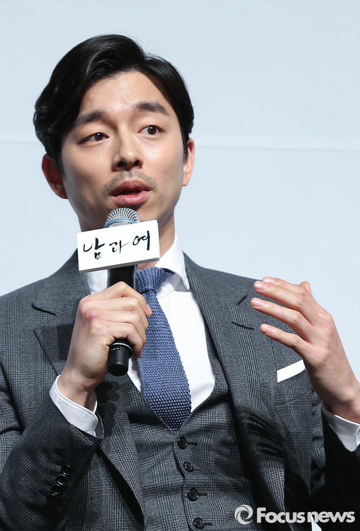 (서울=포커스뉴스) 19일 오전 서울 강남구 압구정 CGV에서 열린 영화 '남과 여' 제작보고회에 참석한 배우 공유가 취재진의 질문에 답하고 있다.