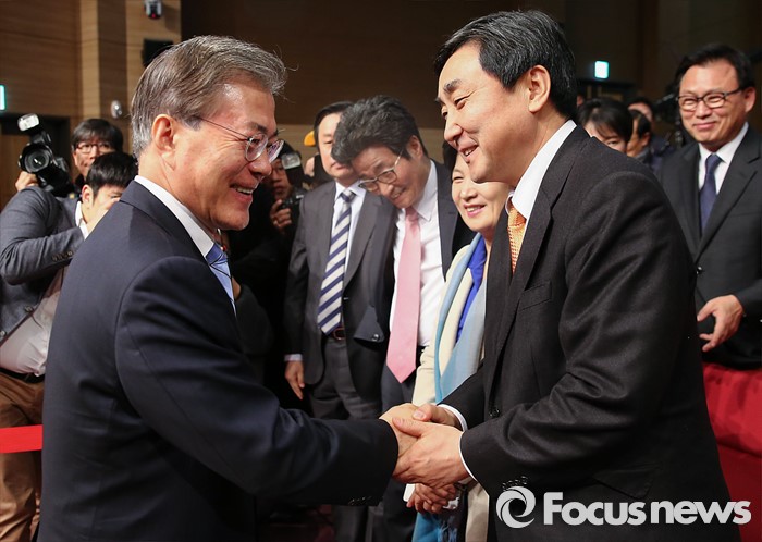 (서울=포커스뉴스) 문재인(왼쪽) 더불어민주당 대표가 19일 오전 서울 여의도 국회 의원회관에서 신년 기자회견을 마친 뒤 이종걸 원내대표와 악수하고 있다.