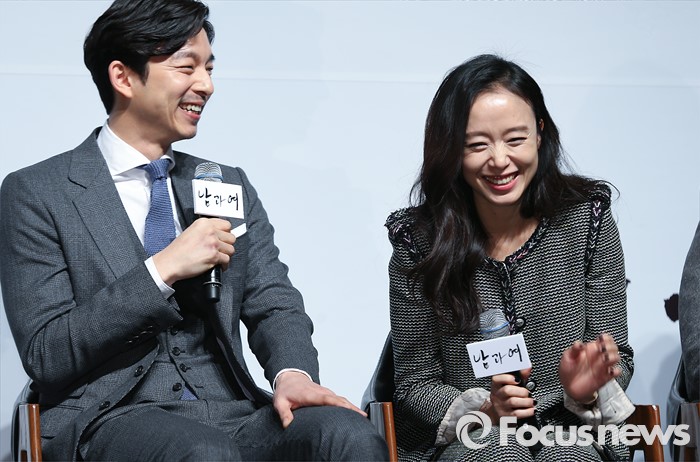 (서울=포커스뉴스) 19일 오전 서울 강남구 압구정 CGV에서 열린 영화 '남과 여' 제작보고회에 참석한 배우 공유(왼쪽)와 전도연이 미소를 짓고 있다.