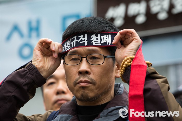 | △ 기자회견 중 머리끈 매는 한상균 위원장 |
