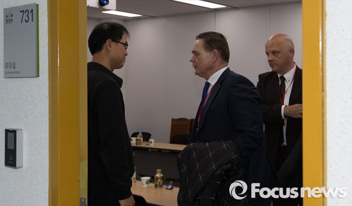 (세종=포커스뉴스) 요하네스 타머 아우디폭스바겐코리아 사장과 프리드리히 요한 아이히러 독일 폭스바겐 파워트레인 총괄책임자 등 독일본사 직원들이 19일 오전 세종시 정부세종청사 환경부 교통환경과에서 결함시정 관련 기술적 내용을 설명하고 환경부 직원과 악수를 하고 있다.