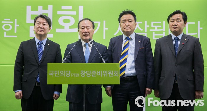(서울=포커스뉴스) 국민의당(가칭)에 영입 된 김봉수 전 키움증권 부회장이 19일 오전 서울 마포구 국민의당 당사 브리핑룸에서 기자들 질의에 답하고 있다. 왼쪽부터 안철수 국민의당 인재영입위원장, 김봉수 전 키움증권 부회장, 김영환 의원, 김관영 디지털정당위원장.