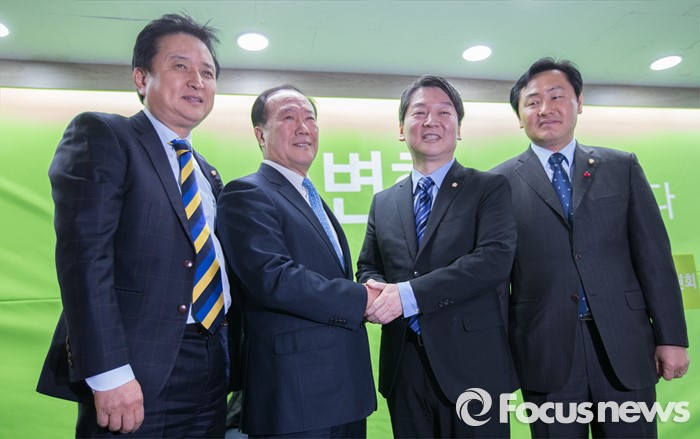 (서울=포커스뉴스) 국민의당(가칭)에 새롭게 합류한 김봉수 전 키움증권 부회장이 19일 오전 서울 마포구 국민의당 당사에서 안철수 인재영입위원장과 인사를 나누고 있다. 왼쪽부터 김영환 의원, 김봉수 전 키움증권 부회장, 안철수 국민의당 인재영입위원장, 김관영 디지털정당위원장.