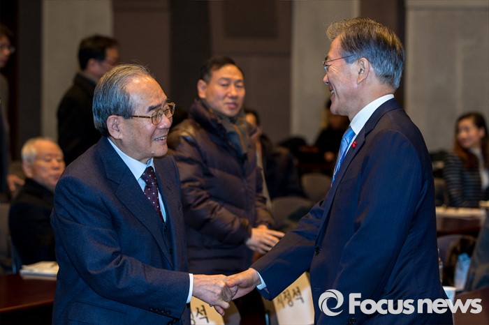 (서울=포커스뉴스) 문재인(오른쪽) 더불어민주당 대표와 임동원 한반도평화포럼 이사장이 19일 오후 서울 중구 프레스센터 국제회의장에서 20대 총선과 남북관계란 주제로 열린 '2016 신년토론회'에 자리해 악수 하고 있다.