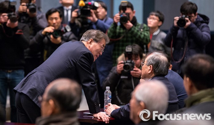 (서울=포커스뉴스) 문재인(왼쪽) 더불어민주당 대표와 임동원 한반도평화포럼 이사장이 19일 오후 서울 중구 프레스센터 국제회의장에서 20대 총선과