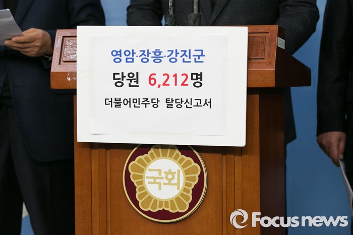 (서울=포커스뉴스) 19일 오후 서울 여의도 국회 정론관에서 전남 영암·장흥·강진군 군민들이 더불어민주당 탈당 기자회견을 하고 있다.