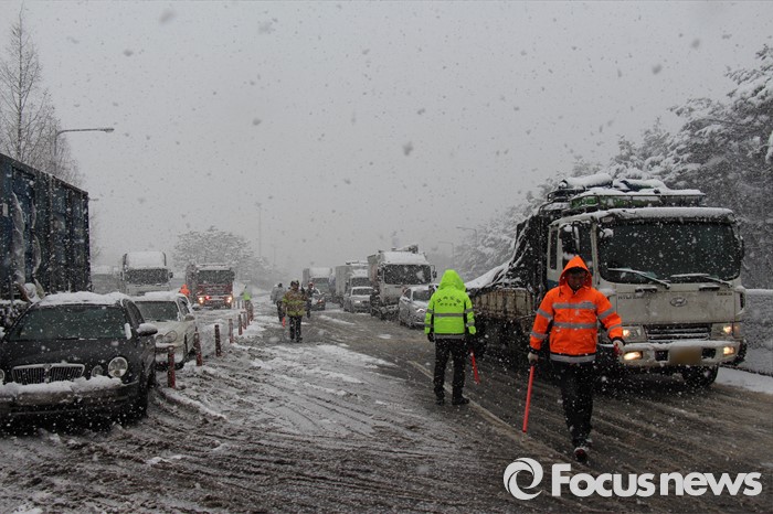 (서울=포커스뉴스) 19일 오후 12시 48분께 전북 정읍시 북면 남산리 호남고속도로 내장산IC와 태인IC 사이에서 차량 30여대가 추돌하는 사고가 발생해 경찰, 소방관, 도로공사 직원들이 사고 수습작업을 하고 있다.