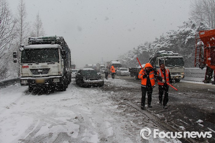 (서울=포커스뉴스) 19일 오후 12시 48분께 전북 정읍시 북면 남산리 호남고속도로 내장산IC와 태인IC 사이에서 차량 30여대가 추돌하는 사고가 발생해 경찰, 소방관, 도로공사 직원들이 사고 수습작업을 하고 있다.