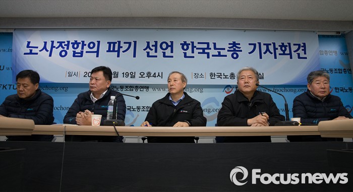 (서울=포커스뉴스) 김동만(오른쪽 두번째) 한국노총 위원장이 19일 오후 서울 영등포구 한국노동조합총연맹에서 열린 노사정합의 파기 선언 한국노총 기자회견에 선언을 끝낸 뒤 취재진의 질문을 듣고 있다.