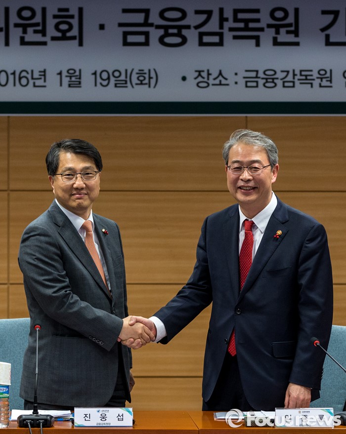 (서울=포커스뉴스) 임종룡 금융위원회 위원장과 진웅섭 금융감독원장이 19일 오후 서울 종로구 금융감독원 연수원에서 열린 '금융위원회-금융감독원 간부 합동연찬회'에 자리해 악수 하고 있다.