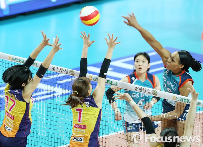 (서울=포커스뉴스) 19일 장충체육관에서 열린 '2015-2016NH농협 V-리그' 여자부 GS칼텍스-흥국생명 경기에서 GS칼텍스 캣벨이 흥국생명 이재영, 정시영의 블로킹에 스파이크를 때리고 있다.