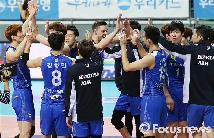 (서울=포커스뉴스) 19일 장충체육관에서 열린 '2015-2016NH농협 V-리그' 남자부 우리카드-대한항공 경기에서 우리카드를 물리치고 선두로 나선 대한항공 선수들이 경기를 마치고 밝은 표정으로 하이파이브를 하고 있다.