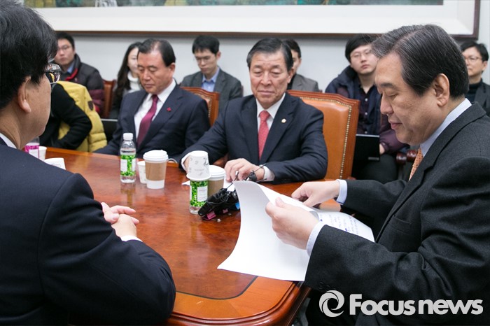 (서울=포커스뉴스) 김무성(오른쪽) 새누리당 대표가 20일 오전 서울 여의도 국회에서 열린 새누리당 제1차 총선기획단 회의에 참석해 자료를 살피고 있다.