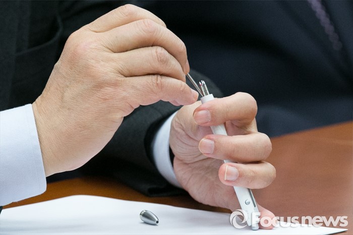 (서울=포커스뉴스) 김무성 새누리당 대표가 20일 오전 서울 여의도 국회에서 열린 최고중진연석회의에 참석해 볼펜을 조립하고있다.