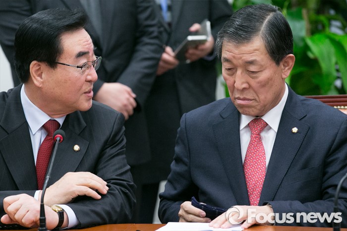 (서울=포커스뉴스) 황진하(오른쪽) 새누리당 사무총장과 김태원 의원이 20일 오전 서울 여의도 국회에서 열린 최고중진연석회의에 참석해 대화하고 있다.