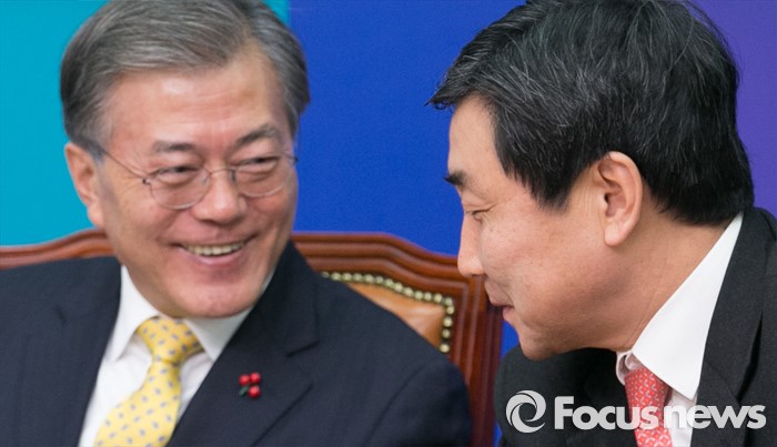 (서울=포커스뉴스) 문재인(왼쪽) 더불어민주당 대표와 이종걸 원내대표가 20일 오전 서울 여의도 국회에서 열린 최고위원회의에 참석해 대화하며 미소 짓고 있다.