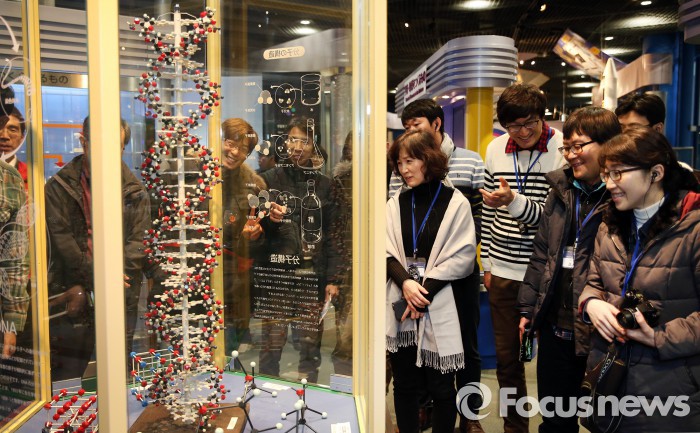 한편 두산연강재단은 2007년부터 '올해의 과학교사상'을 수상한 교사들을 대상으로 과학교사 학술시찰을 진행해 왔으며, 현재까지 총 381명의 교사가 시찰에 참가했다.과학교사 학술시찰단이 19일 일본 오사카 시립과학관에서 DNA 분자구조 모형을 살펴보고 있다. <사진제공=두산그룹>