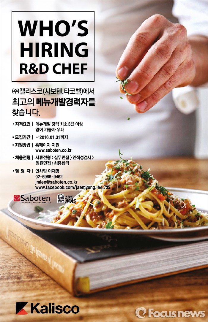 (서울=포커스뉴스) 종합외식기업 캘리스코는 오는 31일까지 메뉴개발 담당자 공개 채용을 진행한다.